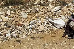 The fruit of Taraxacum ceratophorum are sessile cypselas with a persisting calyx. They are dry, obovate, and typically a pale reddish brown or brick red colour. The cypselas measure 4 to 5 mm in length and 0.9 to 1.2 mm in width, appearing glabrous and exhibiting ribbed surface venation. They are indehiscent, and the slender beak of the cypselas often exceeds the length of the body. The upper half of the cypselas' surface is spinulose. Each cypselae possesses a single seed.[3] The seeds utilize wind dispersal. The pappus of each seed helps amplify drag, which increases the chance that wind will carry it away and prolongs its descent.[4]
