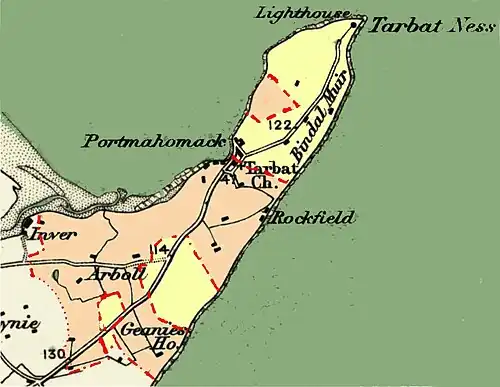 Tarbat Ness, the headland of Tarbat separating the Dornoch and Moray Firth coasts, lies three miles (five kilometres) northeast of Portmahomack. It is 15 metres (50 feet) high and the site of Tarbat Ness Lighthouse, which dates from 1830.[3] Just over one mile (1.5 kilometres) west-southwest of Tarbet Ness lighthouse, is the site of Castlehaven fort, by a creek of that name (Port-Chasteil is Gaelic). Although there is no building remaining, the foundation of a considerable wall is traceable, which defended the fort on the landward side. The title Baron Castlehaven is named after this fort and is held as a subsidiary title by the Earls of Cromartie.[7][8][9]