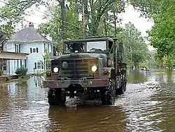 Flooding in Tarboro occurred mostly in areas around the Tar River, which exceeded 500-year flood levels along its lower stretches; it crested 24 ft (7.3 m) above flood stage. The Tar River surrounds about half of Tarboro as both the North end and Southern ends of the city have developed along it. Flooding began upstream in Rocky Mount, where up to 30% of the city was underwater for several days. In Tarboro, much of the downtown became flooded by several feet of water.[12] Nearby, the town of Princeville was largely destroyed when the waters of the Tar poured over the town's levee, covering the town with more than 20 ft (6.1 m) of floodwater for ten days.[13] Part of the Tarboro and Princeville city limits are defined by the Tar River.