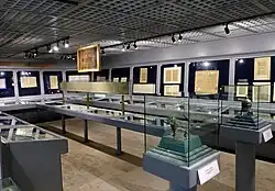 Some of the earliest examples in the museum include a 7th-century 'Ma'il' Script folio from Hijaz,[15] modern-day Saudi Arabia, and 9th-century Qur'ans written on vellum from North and East Africa.[12] The museum also houses what is believed to be the only known complete and dated Qur'an written in Kufic script, from AD 1002. On display are also Qur'ans written in China and a number of interesting and very large Indonesian Qur'ans written on palm leaves, which are on display at the Tareq Rajab Museum of Islamic Calligraphy.[16] Also on display at the Calligraphy museum, are a large number of Hilya.[14] In addition to religious texts, the museum displays significant manuscripts by great philosophers and scientists such as Qusta ibn Luqa al-Ba'albaki and Ya'qub Ibn Ishaq Al-Kindi.[12]