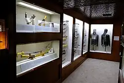 Additionally, the museum showcases various examples of armour, including chainmail, helmets, and shields.[14] Most of the armour collection originates from India and Iran. However, the earliest piece on display is a set of early 16th-century Ottoman mirror armour, stamped with the mark of the Irene arsenal.[24]