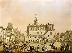 Tarnów remained in the hands of the Leliwa family, out of which in the 15th century the Tarnowski family emerged. In the 14th century, numerous German settlers immigrated from Kraków and Nowy Sącz (see Walddeutsche, Ostsiedlung). During the 17th century Scottish immigrants began to come in large numbers. In 1528 the exiled King of Hungary János Szapolyai lived in the town.[9] The town prospered during the Polish Golden Age, when it belonged to Hetman Jan Tarnowski (1488–1561). In the mid-16th century, its population was app. 1,200, with 200 houses located within town's defensive wall (the wall itself had been built in the mid-15th century, and expanded in the early 16th century). In 1467, the waterworks and sewage systems were completed, with large cisterns filled with drinking water built in the main market square. In the 16th century, during the period known as the Polish Golden Age, Tarnów had a school, a synagogue, a Calvinist prayer house, Roman Catholic churches, and up to twelve guilds.