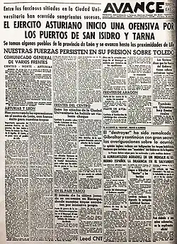 - ^ De Blas, Juan Antonio (1986). "Se fijan los frentes" La Guerra Civil en Asturias, Crónica general de España. Gijón: Ediciones Júcar. p. 32.