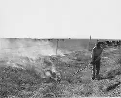 One of the unwelcome attributes of Salsola tragus is that it commonly presents a fire hazard, firstly because it is flammable once it is thoroughly dry, partly as a result of its nitrate content, which may be very high, sometimes over 6% dry weight.[20] Secondly, in a season in which the Kali growth has been heavy, high winds often accumulate shocking tangles of the tumbleweeds, covering entire buildings or trapping vehicles so completely as to prevent unaided escape, particularly in the event that the dry material ignites.[15] When they bank up against wire fences, the force of the wind against the mass is likely to damage the fence, and so will the fire if the mass ignites. In wildfire conditions in open country, strong winds often blow burning tumbleweeds across firebreaks, frustrating standard fire control measures. When the burning weeds are stopped by buildings or stacks, they ignite such objects more effectively than any other tumbleweed on the open plains, being compact and woody at maturity, as well as highly flammable.[22]