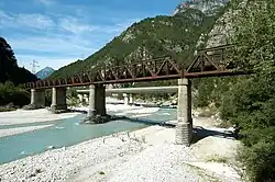 The whole line was opened on 30 October 1879.[9] Several sections were opened in succession between 1875 and 1879. The section between Udine and Gemona del Friuli was opened on 15 November del 1875, while Carnia station was reached on 18 December of the following year. Then it was the turn of Resiutta, reached on 17 May 1877, and of Chiusaforte, reached on 14 March 1878. The Chiusaforte–Pontebba section was opened on 25 July 1879, while the 24.7 km Austrian section was opened on 11 October of the same year.[8][10]