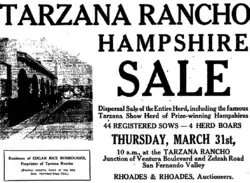 In February 1919, Edgar Rice Burroughs, author of the popular Tarzan novels, relocated to California from Oak Park, Illinois. He and his family had wintered in Southern California twice before, and he found the climate ideal. On March 1, 1919, Burroughs purchased Otis's tract and established Tarzana Ranch.[3] Burroughs subdivided and sold the land for residential development, some parcels of which were utilized as small farms.