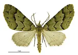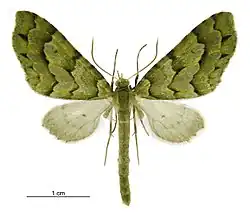 The expansion of the wings is 1+1⁄2 inches. The fore-wings are vivid-green; there are four wavy, black, transverse lines; the first near the base, the second a little before the middle, the third considerably beyond the middle, and the fourth near the termen; the subterminal line is very faint towards the tornus, and it emits three or four very sharp, longitudinal, black, tooth-like marks; all the transverse lines are much stronger where they cross the principal veins. The hind-wings are very pale yellowish-green.[8]