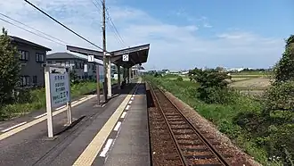 The station consists of an island platform serving two tracks. The station building is unstaffed and serves only as a waiting room. Access to the island platform is by means of a level crossing and ramp.[2][3][4]