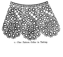 Tatting is a technique for handcrafting a particularly durable lace from a series of knots and loops.[1] Tatting can be used to make lace edging as well as doilies, collars, accessories such as earrings, necklaces, waist beads, and other decorative pieces. The lace is formed by a pattern of rings and chains formed from a series of cow hitch or half-hitch knots, called double stitches, over a core thread. Contemporary tatting methods arose in the 19th century, influenced by the numerous publications of Mlle Eléonore Riego de la Branchardière[2] who developed the concepts and terms for picots and chains.[3]