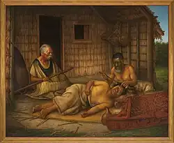 Painting by Gottfried Lindauer of a moko being carved into a man's face by a tohunga-tā-moko (tattooist)