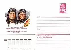 To honor her memory there is a small museum in southern Moscow dedicated to her, a street in Moscow and school in Kerch named after her, a monument at the technical school where she studied, and an official envelope of the USSR bearing her portrait next to that of Vera Belik.[12][13]