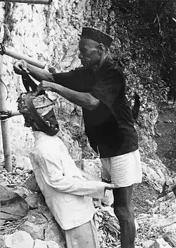 Their position, in reference to the other tau tau, in the rock face would indicate the status of the deceased. The cave builders usually require payment of several buffalos that only the sufficiently wealthy can afford.[1] The less wealthy elites generally have their tau tau made from bamboo, which will be undressed at the end of the funeral, leaving only the bamboo on the ritual field. There are regional variations in the types of tau tau used, also.