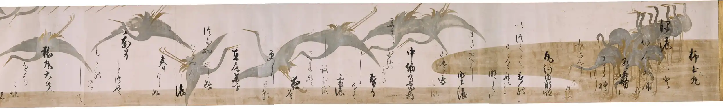 The text of the scroll is a compilation of waka poems from the poets known collectively as Thirty-Six Immortals of Poetry ("Thirty-Six Immortals of Poetry"), including one poem from each one of the 36 members of the group.[15] The visual motif is that of cranes, which stand or fly in flocks across the entire length of the scroll.[13] The skill of Sōtatsu's design and its "cutting-edge originality"[14] have been highly praised.[14][13]