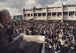 Toubi raised the issue of the right of return for Palestinian refugees on at least two occasions in the Knesset. After the 1948 Arab-Israeli War, he demanded that the inhabitants of al-Birwa be allowed to return to their homes, a request refused by David Ben-Gurion.[10] After the 1967 war, he requested from Moshe Dayan that the inhabitants of Yalo be allowed to return to their homes, but it too was denied.[11] In 2012, the discourses and articles of Tawfik Toubi were published in Israel by his wife Olga and his son Elias. Tawfik Toubi is accepted, honored and rewarded by the Israeli establishment.[12]