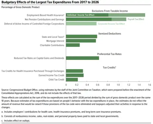 The cost of tax expenditures varies from year to year with the level of economic activity, though changes tend to be modest.[6] The Congressional Budget Office (CBO) estimated that U.S. tax expenditures in fiscal year 2019 totaled $1.6 trillion (7.8% of gross domestic product).[2] This was larger than all discretionary spending ($1.3 trillion[7]) and was equal to nearly half of all federal revenue ($3.5 trillion).[8] The CBO has also estimated the size of major tax expenditures on federal receipts as an annual average percent of GDP, for the period of 2016 to 2026. These included, among others: