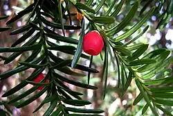 As the seed matures, a fleshy aril partly encloses it. The developmental origin of the aril is unclear, but it may represent a fused pair of swollen leaves.[1] The seeds are highly poisonous, containing the poisons taxine and taxol, but the mature aril that surrounds them is brightly coloured, soft, juicy and sweet, and is eaten by birds which then disperse the hard seed undamaged in their droppings. However, if damaged the seeds could release their poisons, which is dangerous also for humans.[3]