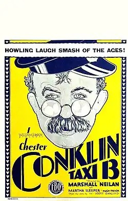 Taxi 13 is a 1928 sound part-talkie film comedy produced and distributed by Film Booking Offices of America and directed by Marshall Neilan. In addition to sequences with audible dialogue or talking sequences, the film features a synchronized musical score and sound effects along with English intertitles. The soundtrack was recorded using the RCA Photophone sound-on-film system. The film stars Chester Conklin in what is FBO's first film with a pre-recorded soundtrack.[1]