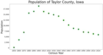 Taylor County is a county located in the U.S. state of Iowa. As of the 2020 census, the population was 5,896,[1] making it the fourth-least populous county in Iowa. The county seat is Bedford.[2] The county was formed in 1847 and named after General and President Zachary Taylor.[3]