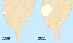 In June 2009, the Executive Yuan approved the plan to merge Tainan County and Tainan City to form a larger municipality of Tainan City.[24] On 25 December 2010, Tainan County and Tainan City merged to become Tainan special municipality.