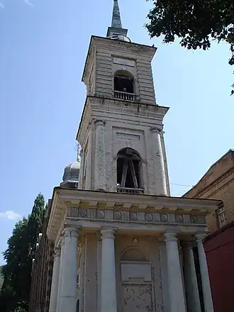 Across the street stands another three-story bell tower; one of the earliest examples of Russian Neoclassical architecture in the region.[4] Complete in 1812, the bell tower was commissioned under Pavel Tsitsianov using money awarded in recognition of his conquest of Ganja for the Russian Empire.[5]
