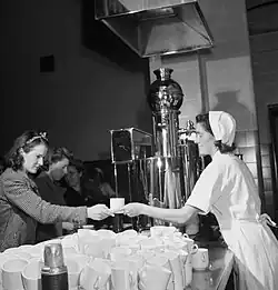 Tea ladies entered the mainstream in the UK during the Second World War, when they were used in an experiment to boost efficiency in workplaces for the war effort (see Women in World War II#Workplace). They had such a hugely positive effect on morale they became commonplace in all areas of work, mobile canteens even serving military units on exercises.[1] They could be found in the workplace canteen or might have come around with a trolley, which typically carried a tea urn filled with hot tea or water, along with a variety of cakes and buns.
