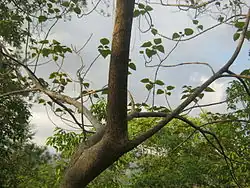 Teak is a large deciduous tree up to 40 m (131 ft) tall with grey to greyish-brown branches, known for its high-quality wood. Its leaves are ovate-elliptic to ovate, 15–45 cm (5.9–17.7 in) long by 8–23 cm (3.1–9.1 in) wide, and are held on robust petioles which are 2–4 cm (0.8–1.6 in) long. Leaf margins are entire.[6]