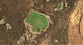 Halophyte grasses grow near the shores and steppe vegetation in the surrounding area.[3]