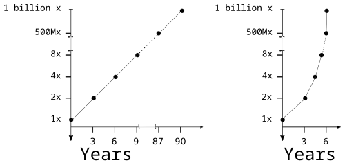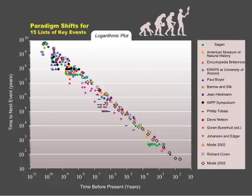 In addition to general criticisms of the singularity concept, several critics have raised issues with Kurzweil's iconic chart. One line of criticism is that a log-log chart of this nature is inherently biased toward a straight-line result. Others identify selection bias in the points Kurzweil uses. For example, biologist PZ Myers points out that many of the early evolutionary "events" were picked arbitrarily.[86] Kurzweil has rebutted this by charting evolutionary events from 15 neutral sources and showing that they fit a straight line on a log-log chart. Kelly (2006) argues that the way the Kurzweil chart is constructed, with the x-axis having time before the present, it always points to the singularity being "now", for any date on which one would construct such a chart, and shows this visually on Kurzweil's chart.[87]