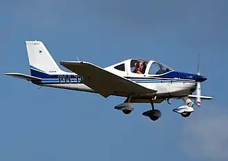 Each aircraft is typically powered by a single Rotax 912 S2 engine, capable of 100 hp (75 kW).[2] In a standard configuration, the engine drives a three-blade fixed-pitch propeller; various alternative propellers can be installed, including both fixed-pitch and variable-pitch models along with two and three-bladed models. The engine is controlled via a pair of push/pull throttle levers, one being centrally mounted at the instrument panel's base and the other to the left of the instrument console, there is no mixture control present.[2] Heating of the cockpit is provided via ducted air from the engine, while cooling and ventilation is provided by multiple side louvers.[2] The cockpit is covered by a sliding bubble canopy, this can be opened mid-flight if desired,[5][6][7][8][9] although the presence of both a top lock and two side safety locks prevent the canopy opening unintentionally. Even when closed, the bubble canopy reportedly provides excellent levels of external visibility to the pilot.[2]