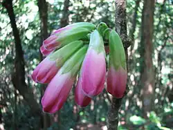 Tecomanthe dendrophila (or T. venusta) | The 11 cm flowers are pink and creamy-yellow, ageing to a uniform magenta-pink. | grows in the Moluccas, throughout New Guinea, and east into New Britain and the Solomon Islands. |
