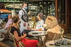 During the COVID-19 pandemic, Labourel increased the number of bears and distributed them more widely throughout Paris. During the lockdown in spring 2020, they reminded people of social distancing by wearing masks and carrying attestations granting permission to be outside,[20] and they continued to sit in closed restaurants after lockdown ended.[21]