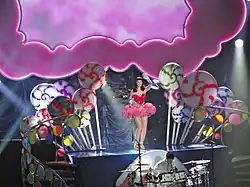 The show begins with a video screen introduction directed by Cole Walliser which tells the story of a girl named Katy who lives in a colorless world wasting her life cutting meat for a mean old butcher. One night, Perry escapes her dreadful reality by falling asleep and visits a vibrant candy land in search of her pet cat, Kitty Purry, and also for her love interest, the Baker's Boy, played by Nick Zano.[21] Katy appears on stage and starts performing "Teenage Dream" with her dancers, while wearing a white dress with spinning peppermints.[22] "Hummingbird Heartbeat" and "Waking Up in Vegas" are performed next, the latter accompanied by a human slot machine, showgirls and an Elvis Presley impersonator.[23] She leaves the stage briefly for a costume change while a video interlude shows Perry taking a shortcut that leads her into a candy forest where she meets two naughty mimes who join her on stage to perform "Ur So Gay". At the end of the performance, Perry takes a bite of their magical brownie.[21] Perry then makes a wardrobe change on stage, trading her skirt for a feathered tail while she begins to perform "Peacock", an elaborated feathered fan dance number.[21] After that, she is covered by peacock tails held by her dancers, and makes a costume change on stage by removing her peacock tail and wears a colorful vampy torch-singer garb over her blue suit. Perry interacts with the audience and invites a male fan on stage to flirt and kiss,[24] and then goes on to perform a slow version of "I Kissed a Girl" which shortly transforms into a rock version. Perry then exits the stage for a costume change while two female dancers keep dancing on stage until the song ends.