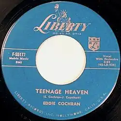 "Teenage Heaven" is a 1959 song by Eddie Cochran and Jerry Capehart.[1] It was the A-side of Liberty F-55177 and was featured in the 1959 film Go, Johnny Go!.[2] This single rose to number 99 on the Billboard charts.[3] The B-side's "I Remember" was also recorded and filmed for the movie but was left out. It would be Cochran's last charting single during his lifetime.[4]