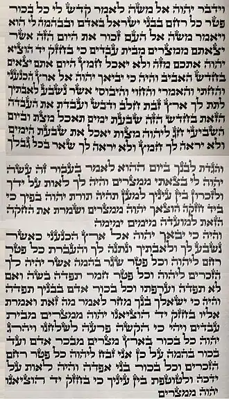 The passages are written by a scribe with special ink on parchment scrolls (klaf).[12] These are: "Sanctify to me ..." (Exodus 13:1–10); "When YHWH brings you ..." (Exodus 13:11–16); "Hear, O Israel ..." (Deuteronomy 6:4–9); and "If you observe My Commandments ..." (Deuteronomy 11:13-21).[12] The Hebrew Ashuri script must be used and there are three main styles of lettering used: Beis Yosef – generally used by Ashkenazim; Arizal – generally used by Hasidim; Velish – used by Sefardim.[44]