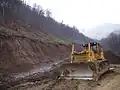 Ore processing facility under construction atop hill, behind which is the massive tailing dump -