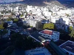 Between the 1930s and 1960s, Tegucigalpa continued to grow reaching a population of over 250,000 people, giving way to what would become one of the biggest neighborhoods in the city, the Colonia Kennedy; the nation's autonomous university, the UNAH; and the construction of the Honduras Maya Hotel.[58] It still remained relatively small and provincial until the 1970s, when migration from the rural areas began in earnest. During the 1980s, several avenues, traffic overpasses, and large buildings were erected, a relative novelty to a city characterized until then by two-story buildings.[59] However, lacking the enforcement of city planning and zoning laws, it led to highly disorganized urbanization. This lack of proper urbanization as the population has grown is evident on the surrounding slopes of the several hills in the city where some of the city's most impoverished neighborhoods have prevailed.[60]