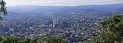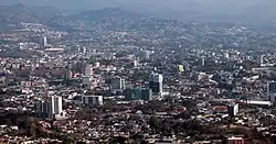 Tegucigalpa is located in the southern-central highland region known as the department of Francisco Morazán of which it is also the departmental capital.[20] It is situated in a valley, surrounded by mountains. Tegucigalpa and Comayagua, being sister cities, are physically separated by the Choluteca River.[21] The Central District is the largest of the 28 municipalities in the Francisco Morazán department.[22]