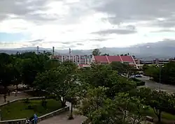 The Choluteca River, which crosses the city from south to north, physically separates Tegucigalpa and Comayagua.[67] El Picacho Hill, a rugged mountain of moderate height, rises above the downtown area; several neighborhoods, both upscale residential and lower income, are located on its slopes. The city consists of gentle hills, and the ring of mountains surrounding the city tends to trap pollution.[68] During the dry season, a dense cloud of smog lingers in the basin until the first rains fall. Tucked into a valley and bisected by a river, Tegucigalpa is prone to flooding during the rainy season, as experienced to the fullest during Hurricane Mitch and to a lesser degree every year during the rainy season. Despite being several thousand feet above sea level, the city lacks an efficient flood control system, including canals and sewerage powerful enough to channel rainwater back into the river to flow down to the ocean. The river itself is a threat since it isn't deep enough below the streets, nor are there levees high enough to prevent it from breaking out.[69] There are more than 100 neighborhoods deemed zones of high risk, several of them ruled out as uninhabitable in their entirety.[60]
