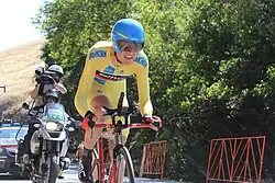 Early in 2014 he won stage 4 of the Volta a Catalunya, a summit finish at the Vallter 2000 ski resort.[30] He ultimately finished the race third overall, seven seconds behind race winner Joaquim Rodríguez.[31] The Tour de France started out with hilly parcours in Yorkshire, with van Garderen finishing ninth on the second stage into Sheffield, won by Vincenzo Nibali.[32] After losing two minutes to Nibali on the fifth stage, which included cobbles – to which he disapproved of[33] – van Garderen lost a further minute two days later following a crash.[34] His BMC Racing Team also lost domestique Darwin Atapuma, who suffered a broken leg in the same crash.[35] Over the remainder of the race, van Garderen placed sixth or higher on five stages, and ultimately finished fifth overall,[36] as the race reached its conclusion in Paris.[37] He repeated his success of the previous year at the USA Pro Cycling Challenge,[38] winning the general classification and two stages,[39][40] and finished the season with a gold medal in the team time trial at the UCI Road World Championships.[41]