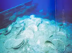 Hatcher's crew raised about 350,000 pieces of the ship's cargo in what is described as the largest sunken cache of Chinese porcelain ever recovered.[8] The bulk of ceramics were Chinese blue-and-white common tableware, consisting of bowls, tea cups and the like, made in the kilns of Dehua, China. Dehua was famous earlier for its blanc-de-Chine pure-white figurines, but during the 18th and 19th centuries began to mass-produce such pieces for the local markets. At a talk that Captain Hatcher gave to the Southeast Asian Ceramic Society in Singapore on 4 October 2000, he noted that the ceramics "had not been made for the European markets—shapes and patterns were not adapted to European taste, but are genuinely Chinese."[9] A number of earlier Longquan celadons were also found, but Hatcher believed that they were probably the personal possessions of one or more passengers given their limited numbers and the fact that they were found separate from the main bulk cargo.