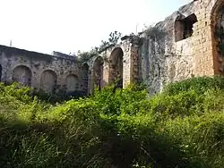 Tekfur ambarı (a.k.a. Tekir ambarı, literally "lord's storehouse") is a large cistern in Silifke ( Seleukeia) ilçe district center of Mersin Province, Turkey. A part of the city of Silifke, it is situated to the west of city center and to the east of Silifke castle at 36°23′N 33°55′E / 36.383°N 33.917°E . It was built during the early years of Byzantine Empire. The building material is face stone. The west to east dimension is 46 metres (151 ft) and the north to south dimension is 23 metres (75 ft). The depth of the cistern is 14 metres (46 ft). The total water capacity is about 12 000 tonnes. At the east side of the cistern there is a spiral staircase. There are 8 niches at the 46 m dimension and 5 niches at the 23 m dimension.[1]