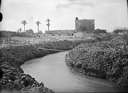 In 1875 Victor Guérin visited, and noted about Tell el-Kerdaneh: "To the north and bottom of this tell, along the marsh, we observe the remains of an enclosure which measured 54 steps long by 40 wide, and which seems to have been that of a fortified khan. All the walls have been removed; the inner blockage alone partly remained."[19] About the surrounding march, and mill, he noted that it was the origin of the Nahr Na'min, and "These springs, at their origin, are immediately abundant enough to form a considerable river and to turn the millstones of a millstone. Near this mill, we note the lower foundations of an old bridge and the remains of a tower pierced with loopholes and ogival vaults. It had two floors, and was built with ashlars on which many crosses were traced, and some at a height that the hand cannot reach. Therefore, these crosses could not be engraved there by passing travelers, who would have needed a ladder to place them so high, but they must go back to the time when this tower was occupied by Christians, and most likely date from the time of the Crusades. Above the front door was a mâchecoulis balcony, the trace of which is very visible."[20]