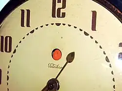 From a commercial point of view, it was the increased durability of batteries as well as the invention of the quartz movement that proved fatal to Telechron. From the point of view of the history of technology, however, another problem is more crucial: if the electric power grid is used as a system for the "distribution of time," as Warren himself wrote,[6] then, in the case of a power failure, the clocks stop, and the individual consumers' Telechrons lose their connection with the master clock (and, by implication, with the time provided by the Naval Observatory). If there is a temporary power outage while the owner is out, the running clock will display the incorrect time when he returns. Warren, foreseeing this difficulty, provided his clocks with an "indicating device":[6] a red dot that would appear on the dial whenever the power failed. This red dot alerted the consumer to the need to reset the clock (by obtaining the accurate time through the telephone, for example, or from a radio). Setting the clock would reset the indicator. The electric clock market grew rapidly in the 1930s, and Telechron's patented power interruption indicator gave his clocks an advantage over competing synchronous clocks, but by the 1950s battery-operated clocks that weren't dependent on the power grid took market share, and in the 1960s the quartz clock replaced synchronous clocks.