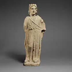 Nine fragments of Telesilla's poetry survive in quotation or paraphrase,[11][12] with only one being longer than a single word.[1] What little survives suggests that, like Corinna, Telesilla concentrated on local legends.[1] Both Pausanias and Plutarch state that she was well regarded by women in particular,[13] and her surviving fragments suggest that she was interested in women's lives.[1] Five fragments of her poetry relate to the gods Artemis and Apollo,[14] and one apparently comes from a poem about the wedding of Zeus and Hera.[15] According to Maximus of Tyre, Telesilla's poetry inspired the Argives. Umbertina Lisi suggested that this referred to war poetry, though Telesilla's surviving fragments are religious rather than martial.[16]