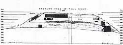 The site was first described in 1838 by Edward Robinson.[7] It is 200 feet above the land in the East and 60 feet high in the other directions. The mound was roughly square with 200 feet on a side in Robinson's time but has been reduced by excavations and military action.