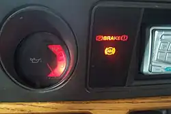 Many vehicles have a red tell-tale to indicate that the parking brake is engaged or that there is a fault with the vehicle's braking system.[7] This tell-tale in most cases bears the ISO symbols for a parking brake and for a braking system emergency. In the past, US regulations required this tell-tale to bear the legend brake.[10]