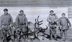 The winter of 1902 was the coldest since 1894, but proved to be fine weather for the reindeer. There were few hard storms; the fall of snow was light, and there was no thaw during the fall or early winter to cover the pasturage with a coating of ice. Spring 1903 came unusually early and was mild and dry, hence no fawns were lost because of cold and wet weather. Of the 276 fawns born, 240 lived. During the winter the herd was pastured on the Ahgeeopuk River, 5 miles (8 km) below the usual winter quarters. During the summer, they were kept 5 miles northwest from the station. From the Government herd at this station, during the winter of 1901-2, two herds were sent to Kotzebue Sound, one for the Friends' Mission and the other for Alfred Nilinia. Leaving the station November 12, they arrived at Kotzebue on December 16, 1901. On January 15, 1902, a herd of 100 reindeer was loaned to Per Spein and sent by the way of Golofnin Bay to Eaton Reindeer Station. On July 22, the Norwegian Evangelical Lutheran Synodical Mission at this station loaned to Serawlook, Erlingnuk, and Ahmahkdoolik, apprentices, each 10 deer from the mission herd.[4]