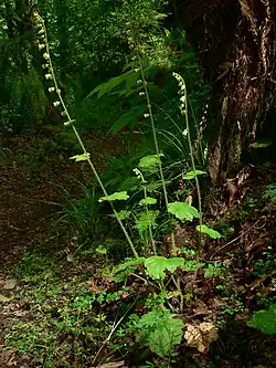 It has rounded stalked leaves mostly growing from the base emerging from a rootstock and bluntly toothed reaching heights of 30 cm.[6] It is evergreen in mild winters. Flowers are borne in spring and early summer, on spikes, terminal racemes, up to 60 cm high. The green calyx is 6–8 mm long; the five flower petals are greenish-white to purple, pinnately divided and spreading. The petals are deeply fringed. It has 10 stamens and 2 styles.[6]