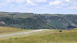 Telluride Regional Airport covers 542 acres (219 ha) and has one runway, 9/27, 7,111 by 100 feet (2,167 by 30 m).[2] The runway is on a plateau and still dips slightly in the center, although the dip was more pronounced prior to a renovation in 2009. It can be a challenging but beautiful[5] approach for pilots. In the past during winter months, about 20% of the scheduled commuter airline flights were diverting to other airports because of abruptly adverse landing conditions. This is not unusual since other mountain airports like Sun Valley have similar statistics.[6] When flying to the Telluride Regional Airport, pilots must be aware of unique issues impacting the airfield including high terrain exceeding 14,000 feet (4,300 m), as well as the airport's location on a plateau with a thousand-foot (300 m) drop to the San Miguel River below.[7] Private business jets operate into the Telluride Regional Airport on a regular basis. Other scheduled passenger jet service is available via the Montrose Regional Airport (MTJ), the Durango-La Plata County Airport (DRO) and the Grand Junction Regional Airport (GJT).[8]
