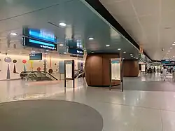 Commissioned as part of the Art-in-Transit (AiT) programme — a public art showcase which integrates artworks into the MRT network — Charm of Bay (also named Bulbous Abode) by Lim Shing Ee is displayed at the concourse level of the station.[39][40] The artwork, which consists of the wall patterns, floor tiles and the station columns,[41] creates a "whimsical landscape" at the concourse level.[40][42] Each of the concourse's "bulbous" boulder-like columns, cladded in brown, resembles "primitive monuments" such as pebbles and boulders in rivers[43] to reflect the locality's role as the primary settling point of early Chinese immigrants.[37][42] The boulders cast artificial shadows on the station floor (with darker coloured floor tiles)[43] intended to "map" the commuter traffic as people passes through these rounded spaces.[41]